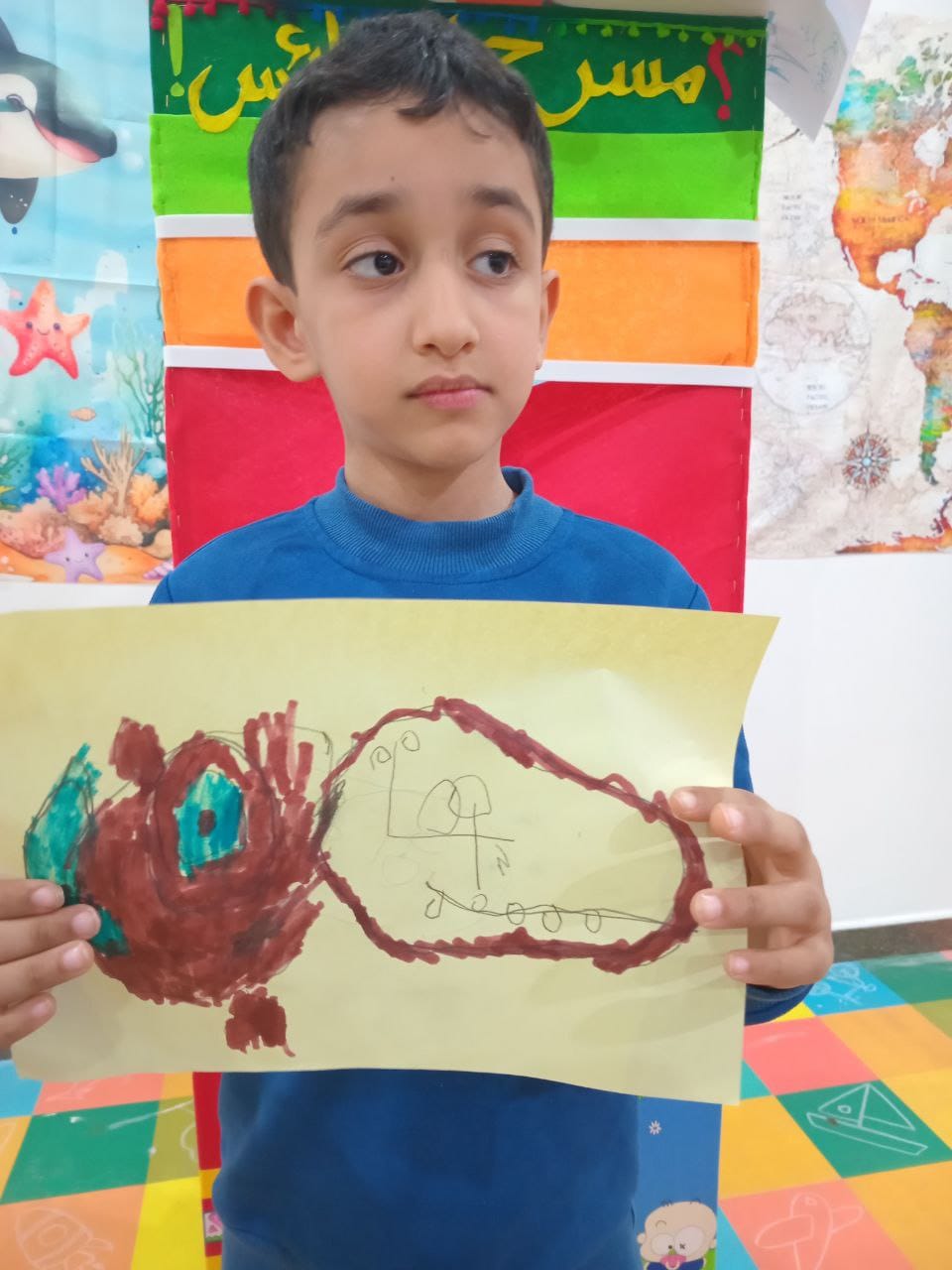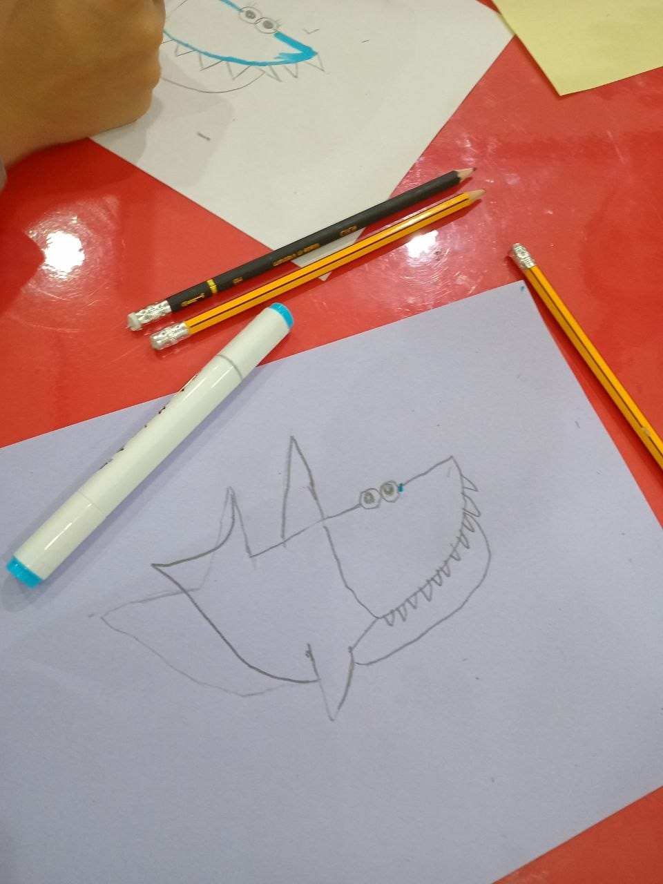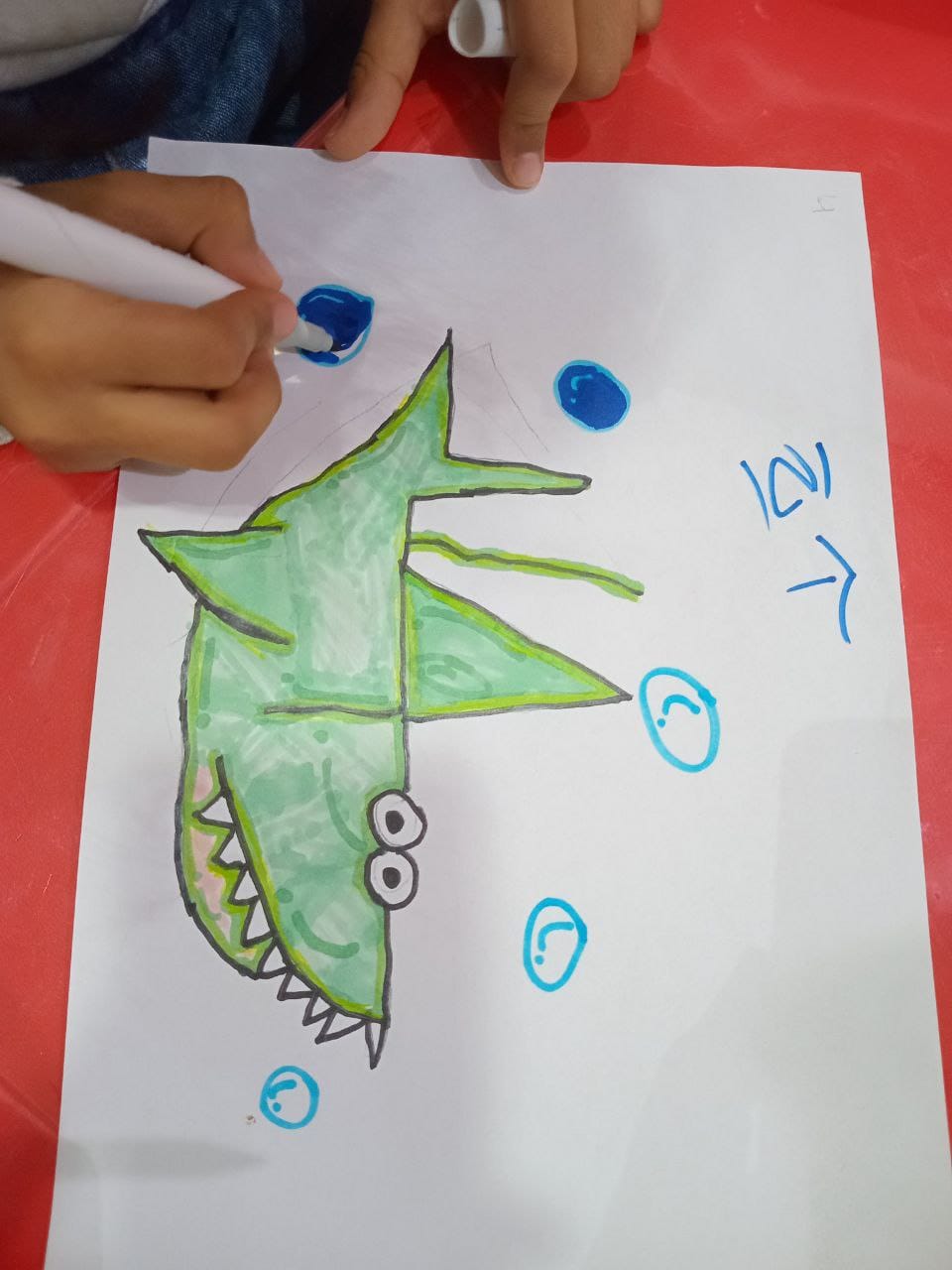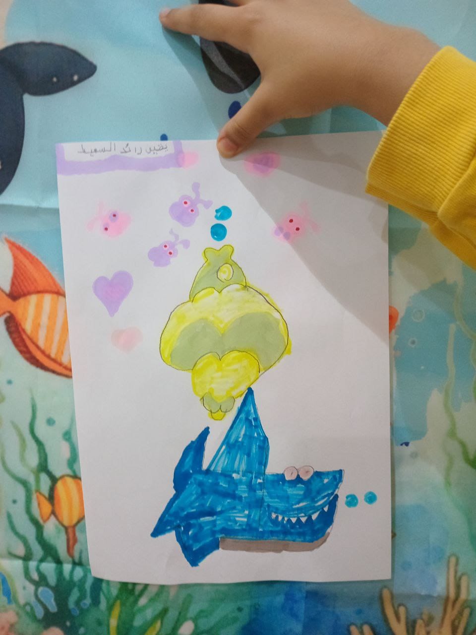ثم رسم الأطفال أسماك القرش والأسماء الذهبية بعد مشاهدة خطوات الرسم بخطوط مبسطة للغاية، ومن ضمنها بعض الأرقام الإنجليزية.