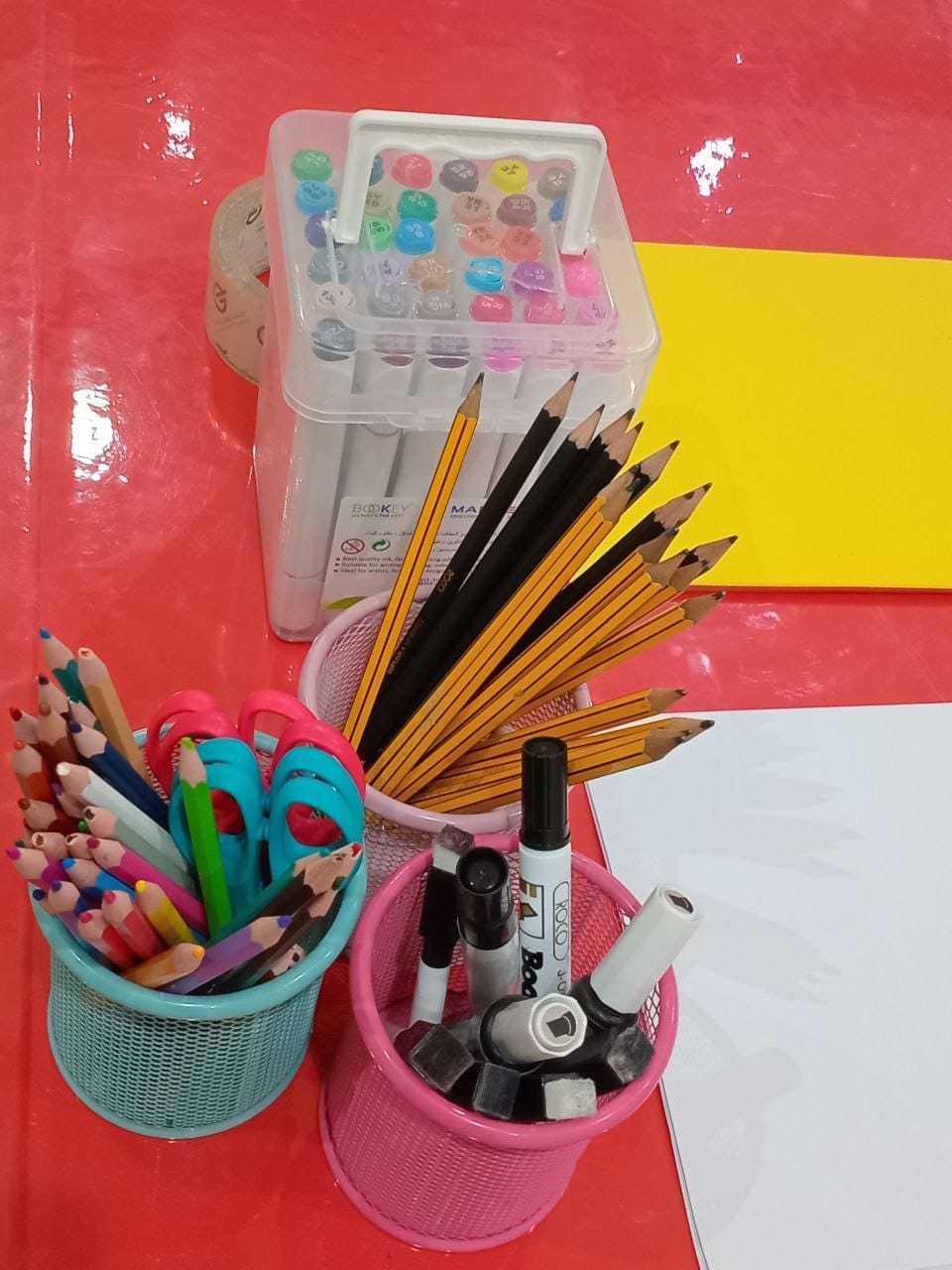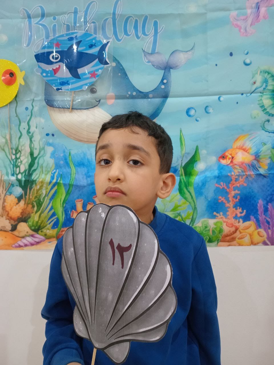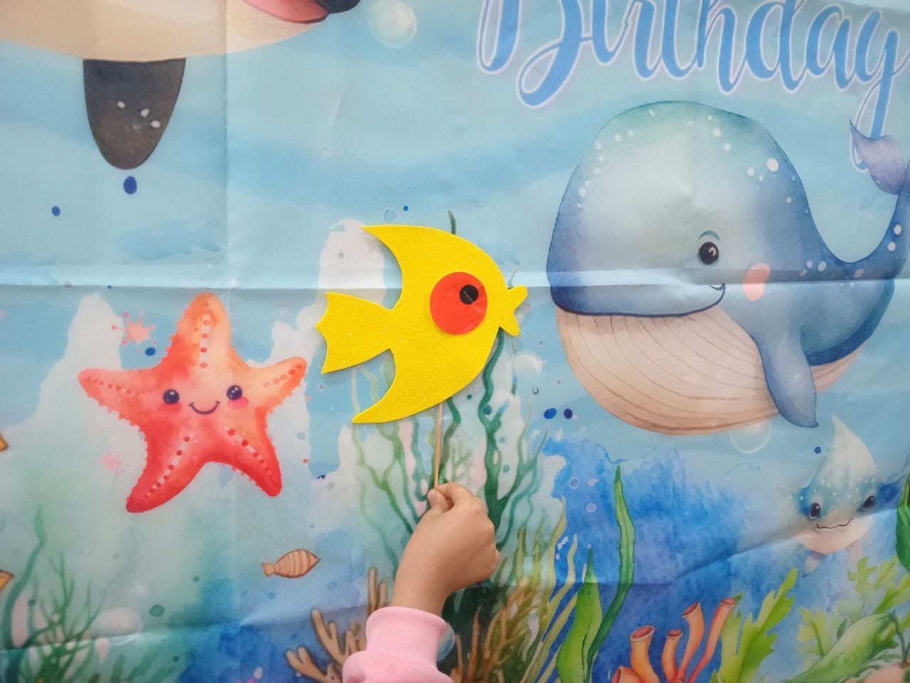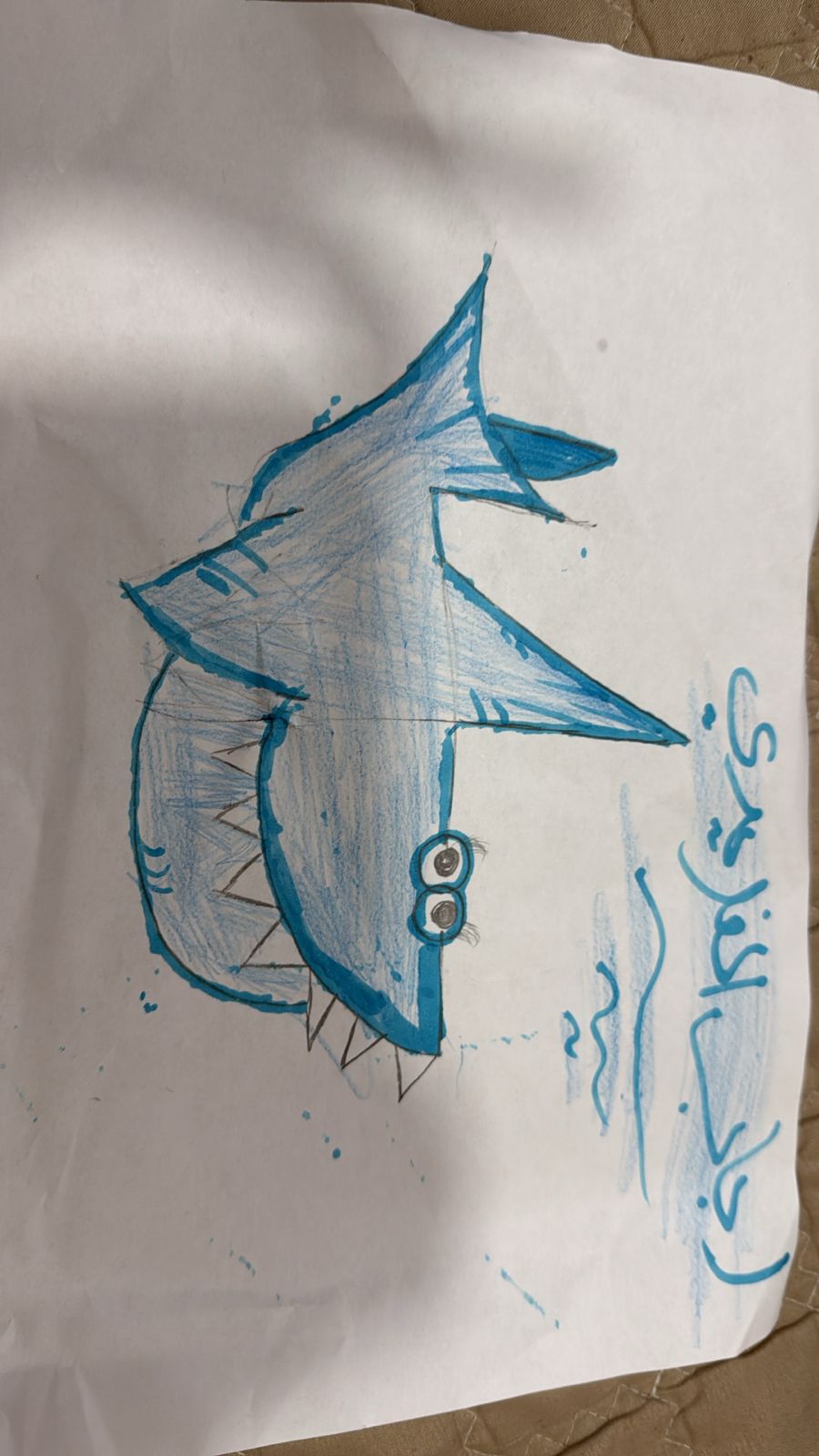 ثم رسم الأطفال أسماك القرش والأسماء الذهبية بعد مشاهدة خطوات الرسم بخطوط مبسطة للغاية، ومن ضمنها بعض الأرقام الإنجليزية.