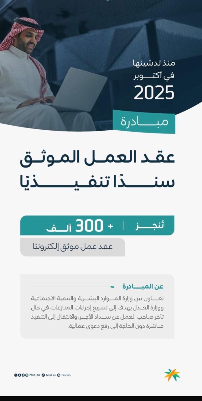 أطلقت وزارة الموارد البشرية والتنمية الاجتماعية، بالتعاون مع وزارة العدل، مبادرة «عقد العمل الموثق» التي تهدف إلى توثيق عقود العمل إلكترونيًا، بما يسهم في حفظ حقوق أطراف العلاقة التعاقدية وتعزيز موثوقية سوق العمل.