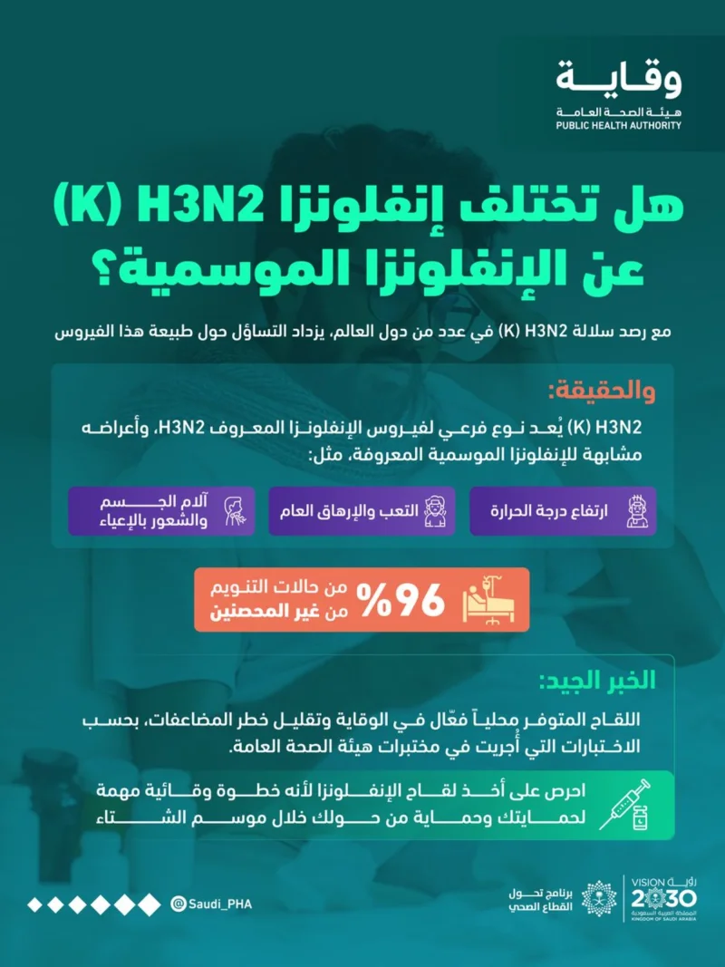 وأوضحت الهيئة أن الفيروس يُعد نوعًا فرعيًا من H3N2 وأن أعراضه مشابهة للإنفلونزا المعتادة، مثل الحمى والإرهاق وآلام الجسم.