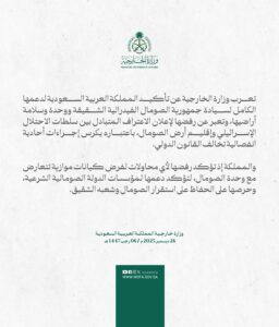 أعربت وزارة الخارجية عن تأكيد المملكة العربية السعودية لدعمها الكامل لسيادة جمهورية الصومال الفيدرالية الشقيقة ووحدة وسلامة أراضيها، وتعبر عن رفضها لإعلان الاعتراف المتبادل بين سلطات الاحتلال الإسرائيلي وإقليم أرض الصومال، باعتباره يكرس إجراءات أحادية انفصالية تخالف القانون الدولي.