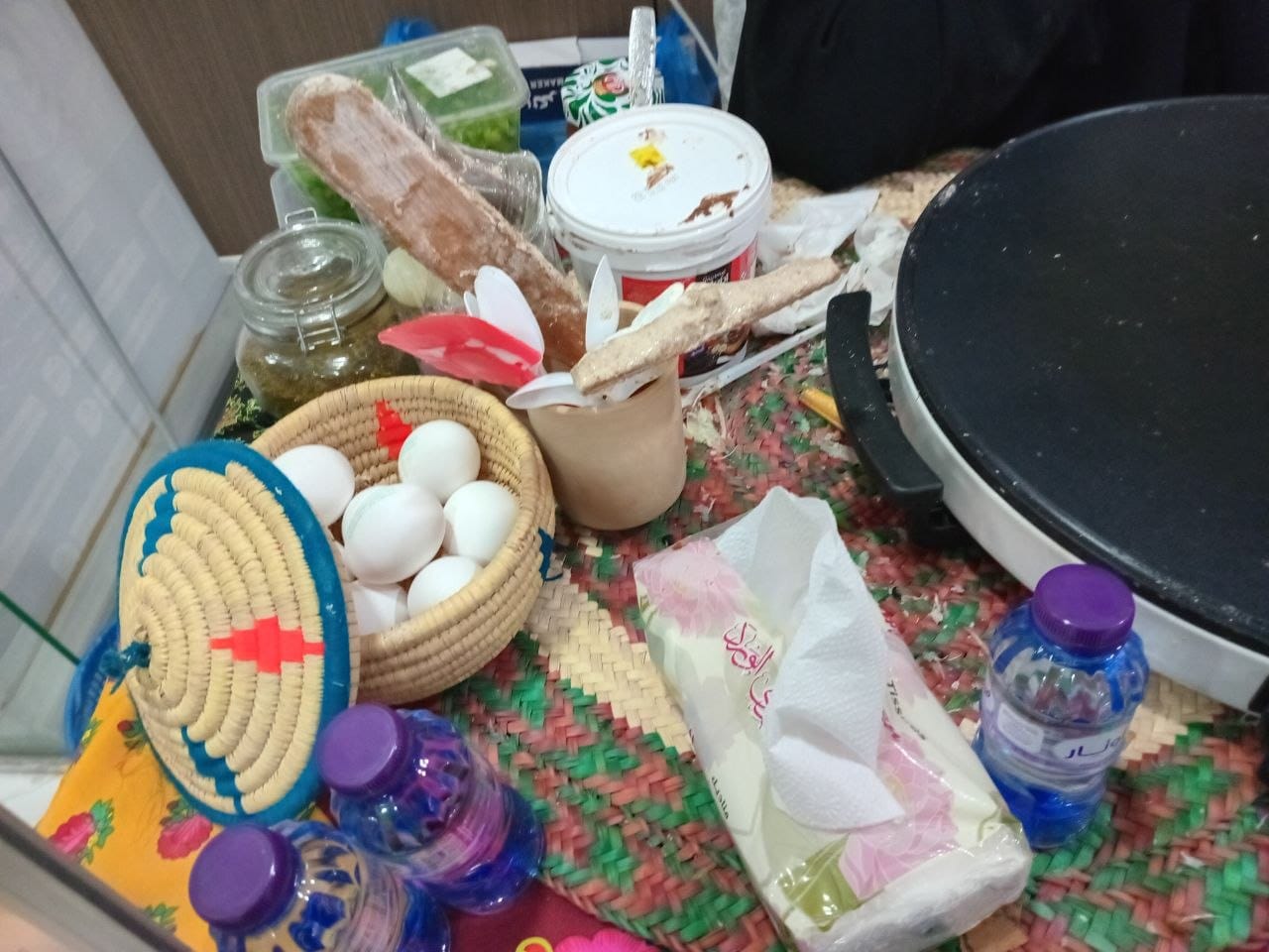 وفي ركن التاوة كانت إحدى الشابات تقوم بتحضير خبز المسح وقالت بأنها مارست هذه المهنة منذ ثلاثة أعوام واكتسبتها من إحدى الممارسات، وأنها تستخدم الدقيق والسكر، وتستخدم جهاز التاوة الكهربائي. وفي ركن الحناء كانت الحناية تقوم بنقش الحناء على أيدي الفتيات، وأخبرتنا بأنها مارست نقش الحناء منذ أن كانت طالبة في المرحلة المتوسطة، واكتسبت خبرة لا تقل عن عشرين عامًا، وأن نقش الحناء علمها الصبر والتحمل والبشاشة مع الزبائن، وتقبل رأيهم وانتقاداتهم، دون انفعال أو عصبية.