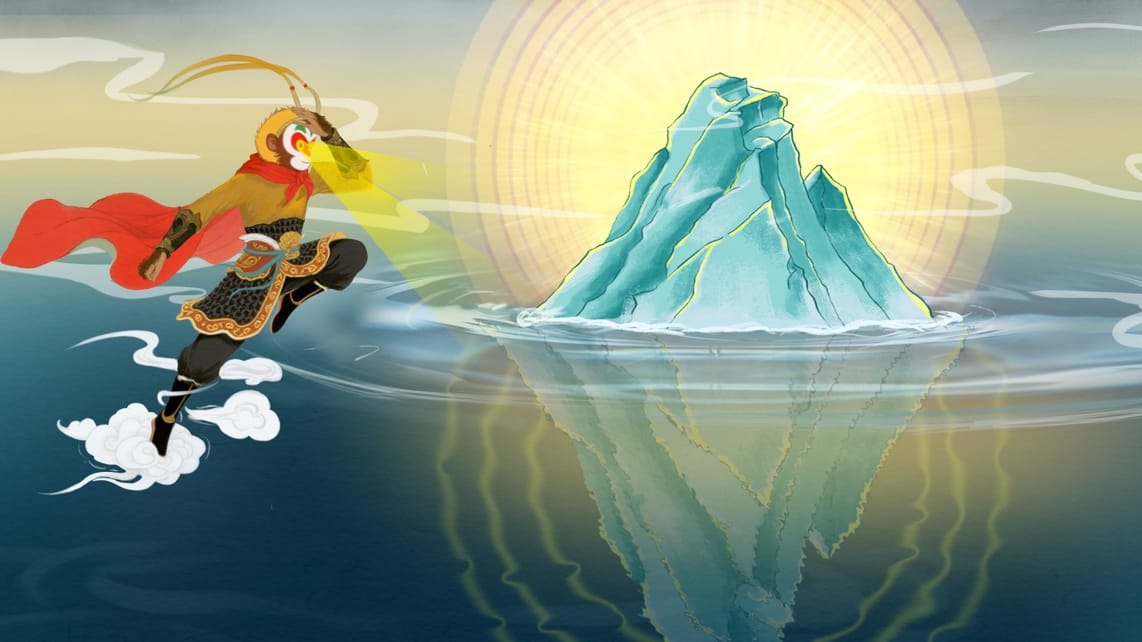يستخدم هذا الشكل “عيون الحقيقة النارية (3)” الشهيرة لسون ووكونغ (ملك القرود) كاستعارة لأخذ عينات من عملية الانتباه المنتظمة والمتكررة، موضحًا كيف يُعدِّل الوعي البصري هذه العملية. تُصدر عيون سون ووكونغ النارية إشارات مركزة تشبه الأشعة باتجاه جبل جليدي – نصفه ظاهر فوق سطح البحر (حالة الوعي البصري) ونصفه الآخر مغمور تحته (حالة اللاوعي البصري). تُنتج الأشعة التي تستهدف الجزء الظاهر (من الجبل) هالات أسرع وأكثر سطوعًا، بما يتوافق مع أخذ العينات المُسرَّع والمُحسَّن بواسطة الوعي البصري. في المقابل، تُنتج الأشعة المُوجَّهة إلى الجزء المغمور (اللاوعي) هالات أبطأ وأقل سطوعًا، مما يعكس أخذ العينات الأساس الذي يستمر دون وعي. (صورة من إعداد الدكتورين جيانغ يي ويانغ فانغ)