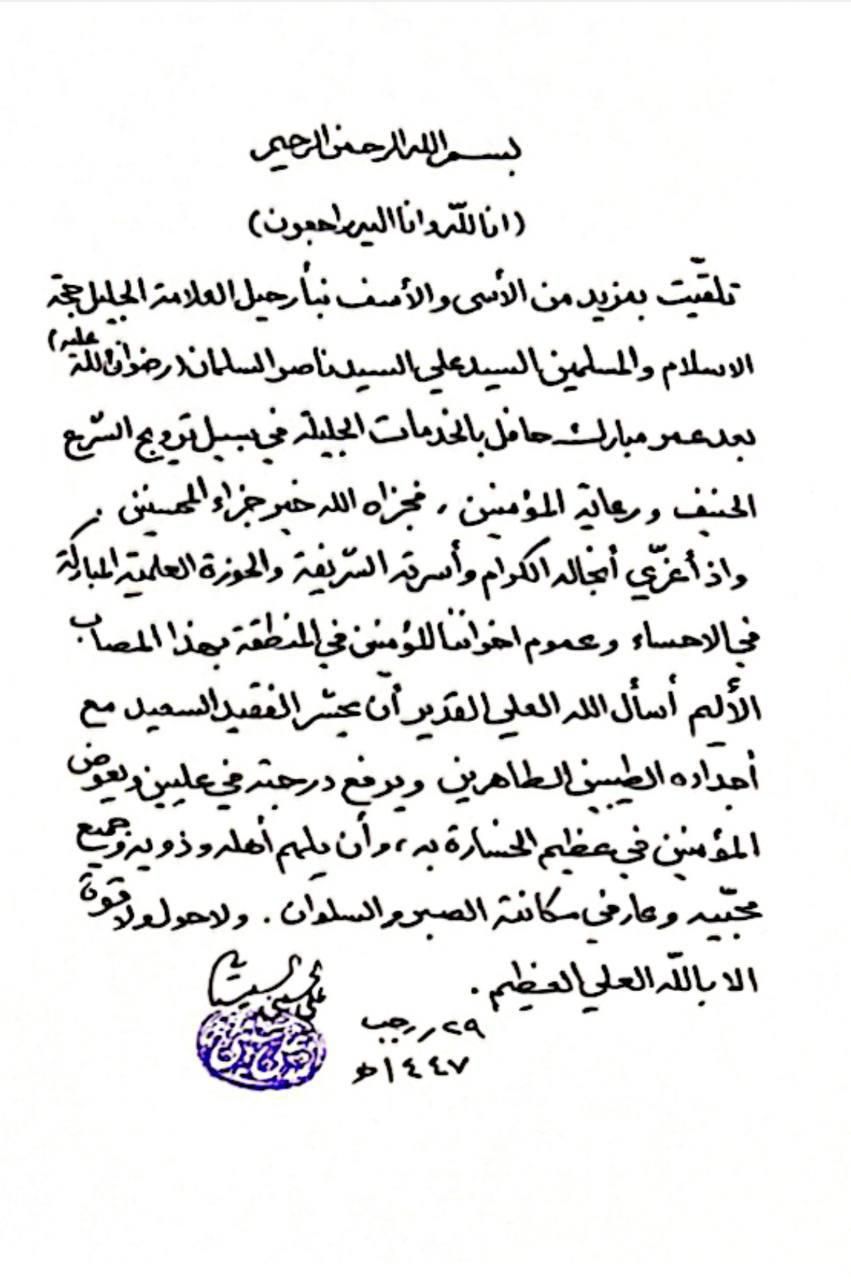 وأعزي أنجاله الكرام وأسرته الشريفة والحوزة العلمية المباركة والحوزة العملية المباركة في الأحساء وعموم إخواننا المؤمنين في المنطقة بهذه المصاب الأليم.